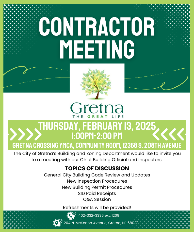 Mark your calendars for February 13th, 1 PM–2 PM and join the Building and Zoning Department at the Gretna Crossing YMCA Community Room for important 2025 updates.