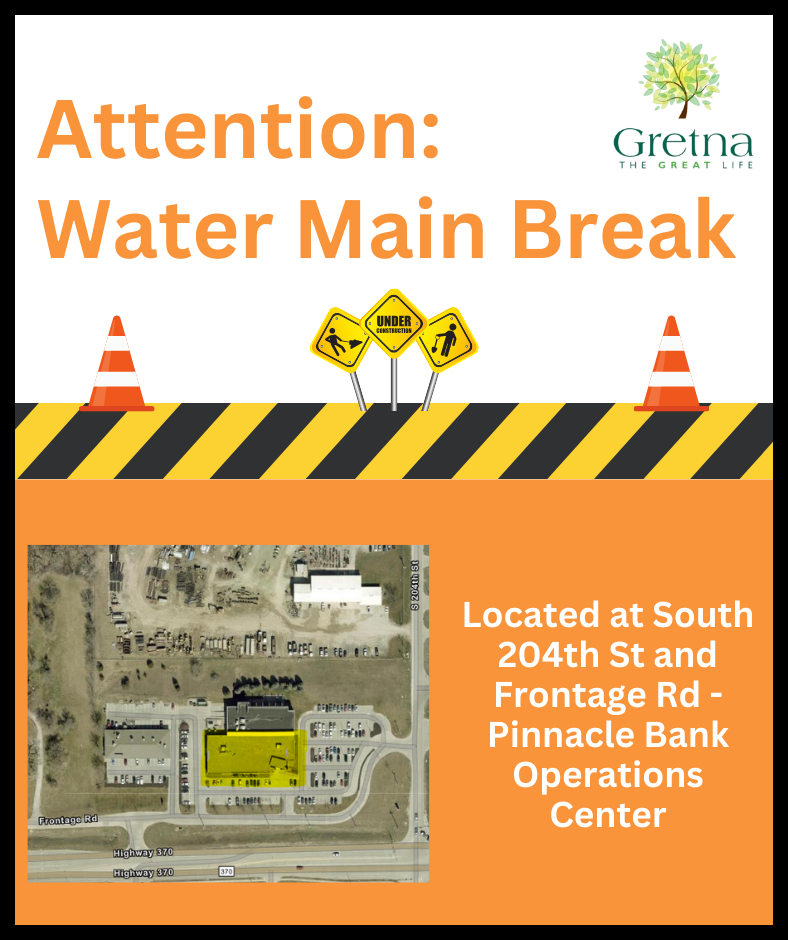 Water Main Break at South 204th St and Frontage Road. Emergency locates have been called in and our Utility Crew will be performing repairs. Please use caution in this area for the time being.
