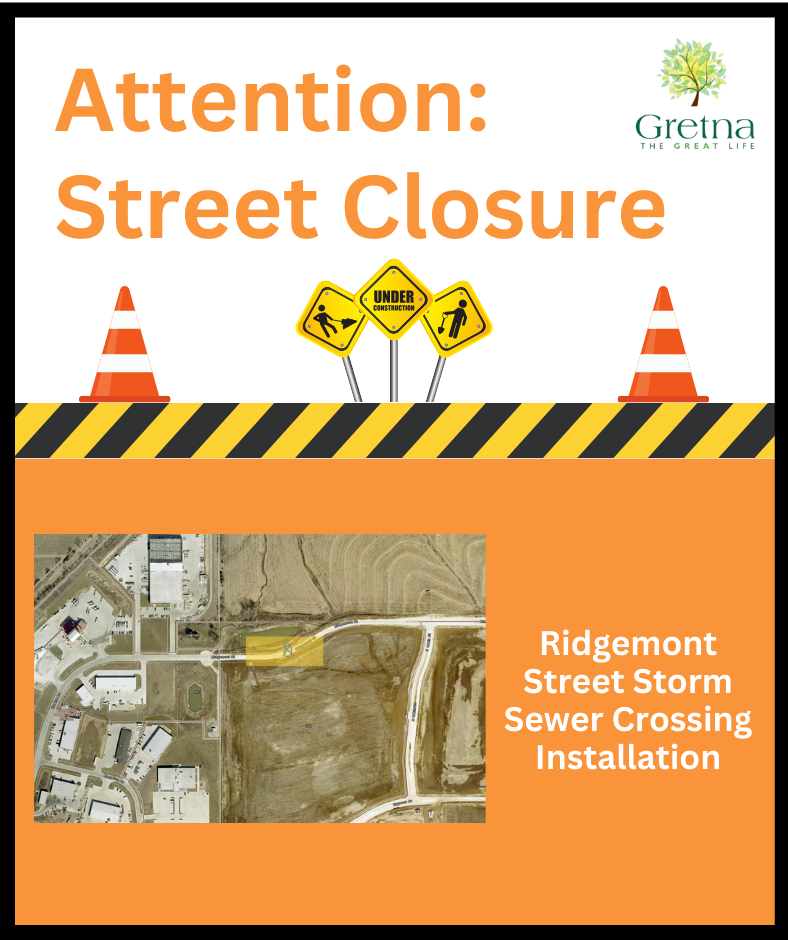 Monday, February 3rd, 2025, there will be a street closure at Ridgemont Street to install a storm sewer. This road will be closed for approximately a week. We apologize for any inconvenience this may cause!