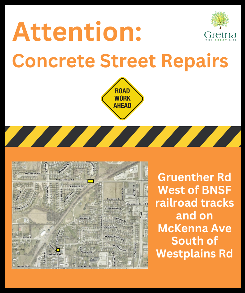 The City’s Contractor, NL&L Concrete, is set to begin concrete panel reconstruction on Gruenther Road west of the BNSF railroad tracks and on McKenna Avenue south of Westplains Road on Tuesday, May 27th. Construction is expected to last 3 days, weather permitting.