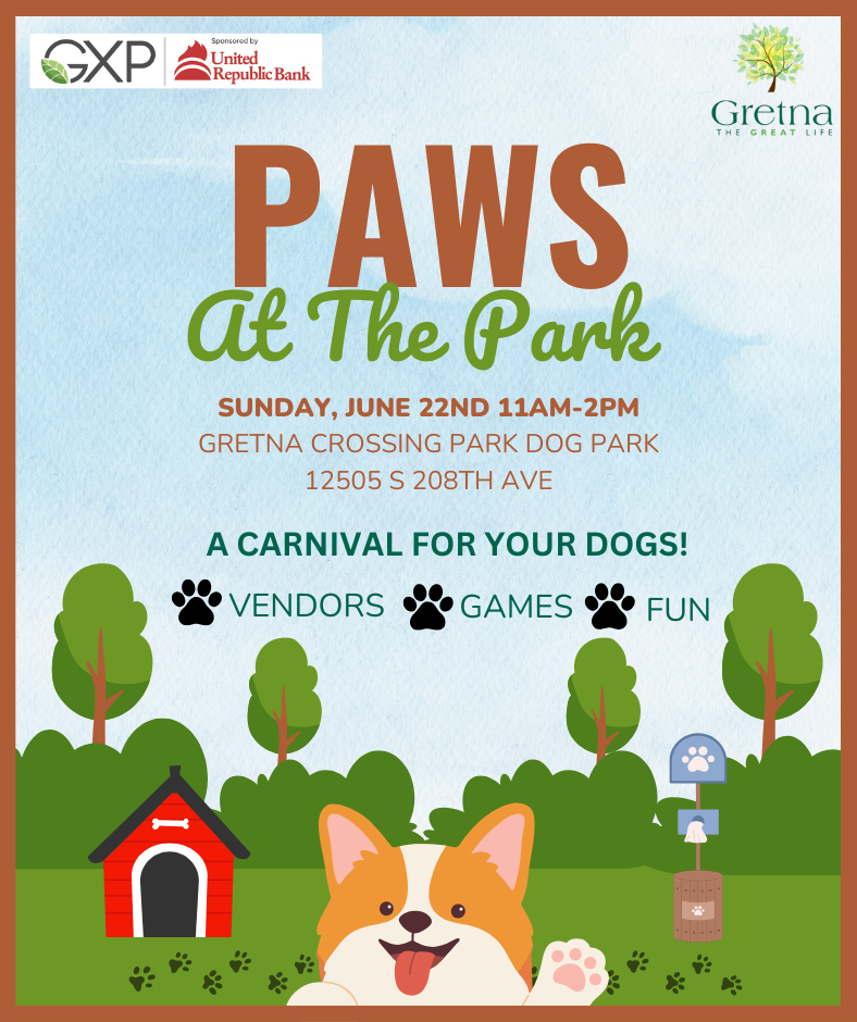 The City of Gretna announces their second annual Paws at the Park, located at the Gretna Crossing Park sponsored by United Republic Bank. The Dog Park is located at 12505 S 208th Ave, Gretna NE.