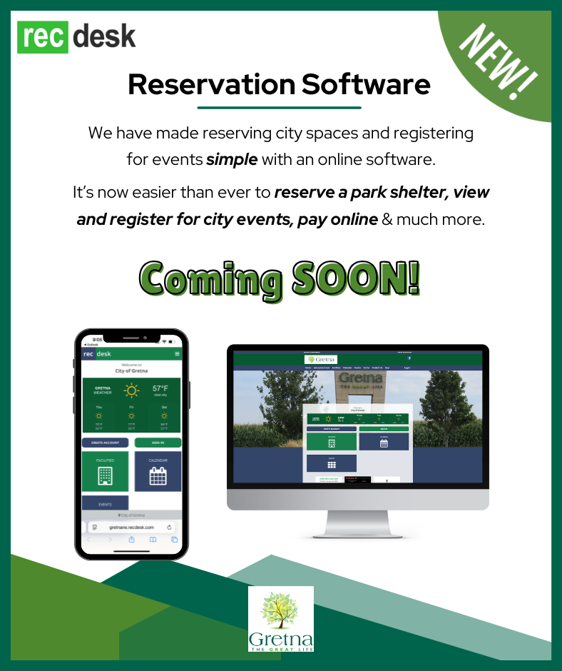 The City of Gretna has partnered with RecDesk to make it easier than ever to reserve park shelters, register for City events, pay online, and more — all from your phone or desktop! 🙌