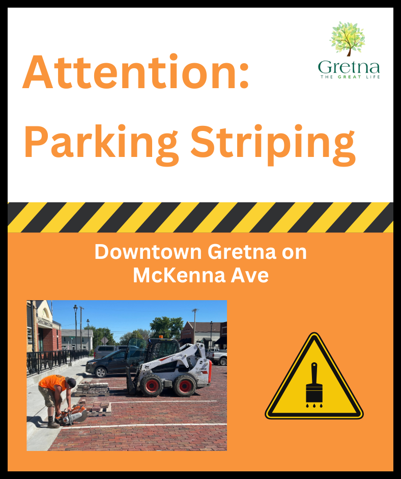 The City of Gretna Public Works Department will begin parking striping on Wednesday, June 18, weather permitting.
