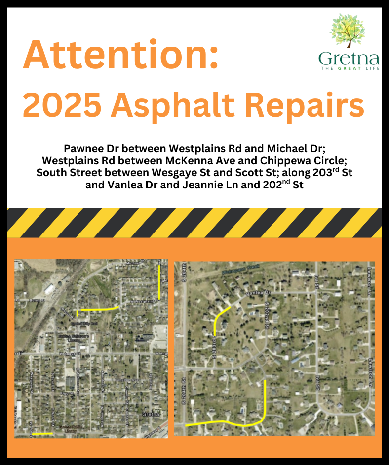The City’s Contractor, Pavers, Inc., will begin asphalt pavement resurfacing on Pawnee Drive between Westplains Road and Michael Drive; Westplains Road between McKenna Ave and Chippewa Circle; South Street between Wesgaye Street and Scott Street; and along 203rd Street and Vanlea Drive, and Jeannie Lane and 202nd Street on Wednesday, July 16th. Construction is expected to last 4 days, weather permitting.