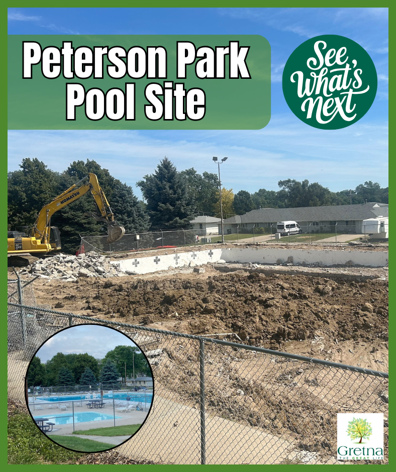 The old city pool at Peterson Park that served Gretna families for generations was removed beginning September 3rd. As the facility aged, the cost to restore it to a long-term usable condition became too high. Mayor Evans noted, “The Peterson Park pool has been a landmark for our Gretna citizens for over 50 years. It was a difficult decision to remove a facility that created so many great memories, but the financial reality was that continuing as it was designed was not a reasonable choice.”
