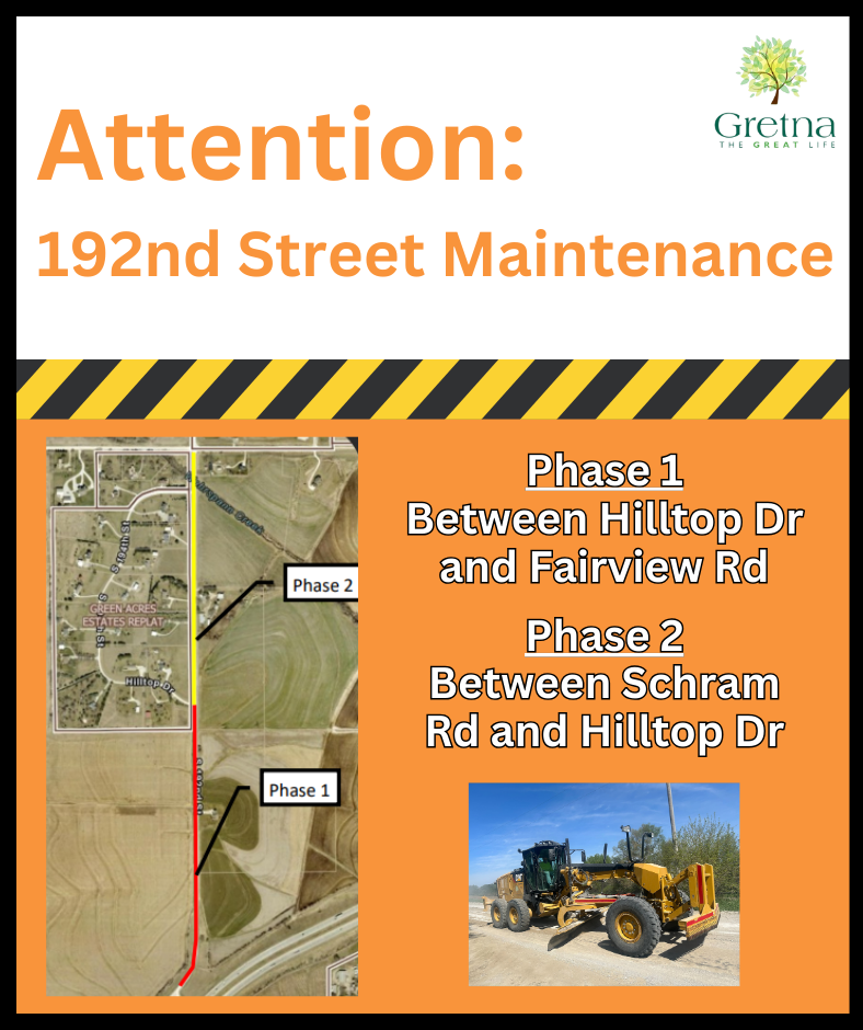 The City’s Contractor, R.L. Ruff, Inc., will begin rock surfacing maintenance on 192nd Street from Schram Road to Fairview Road on Monday, September 22nd. Construction is expected to last 1 week, weather permitting.