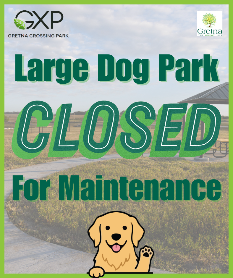 The large dog park at Gretna Crossing Park will be closed starting next Tuesday for approximately one week, weather permitting. During this time, we’ll be seeding the grass and installing water lines for a new sprinkler system to keep the park lush and green.
